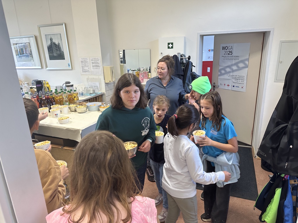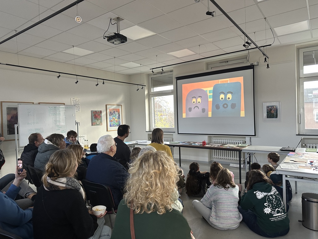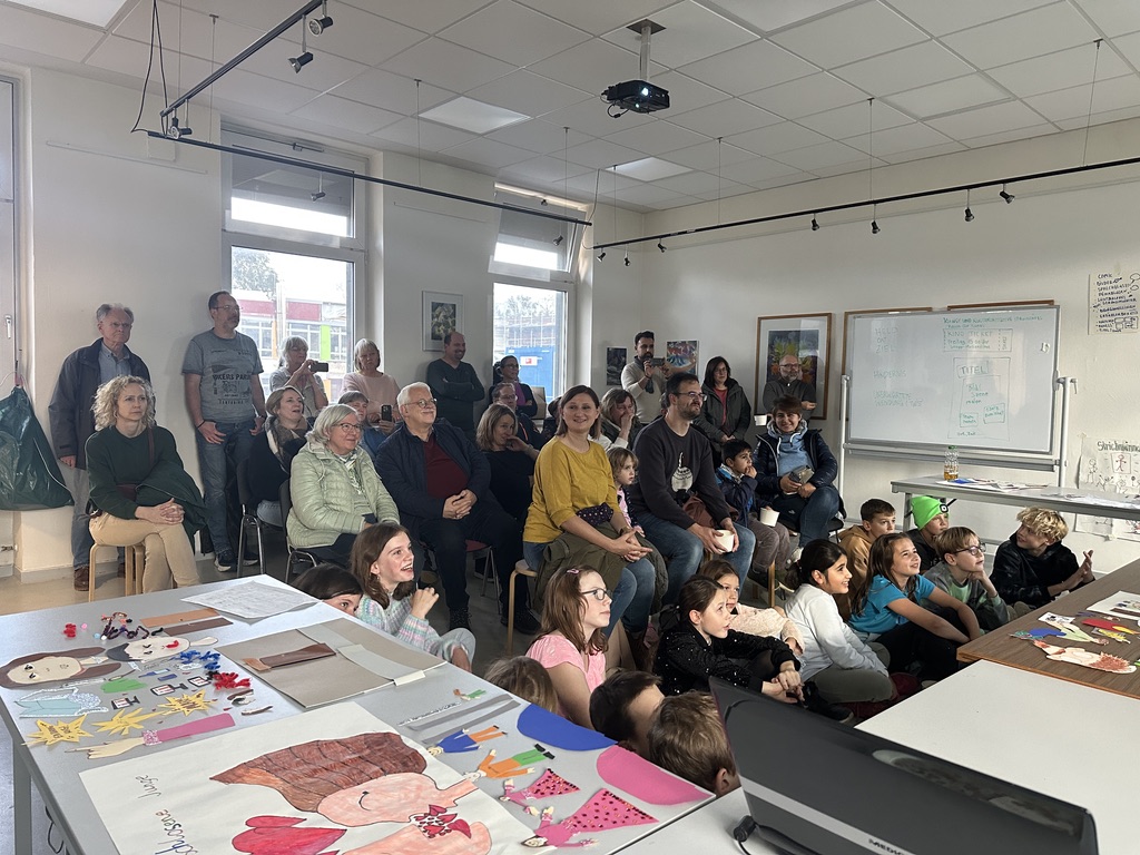 Am Ende der Woche wurden die Filme fertiggestellt, d.h. die Szenen wurden geschnitten, mit Geräuschen und Musik hinterlegt und um Vor- und Abspann ergänzt. Als Höhepunkt wurden Familien, Freunde und Gäste eingeladen, die bei der Abschlusspräsentation von 15 bis 17 Uhr im „Kino“ die fertigen Filme bewundern konnten. Der Raum für Kunst war prall gefüllt und die Zuschauer begeistert. Stilecht gab es selbstgestaltete Eintrittskarten, die am Eingang abgerissen wurden, zur Vorführung gab es Popcorn und Getränke.