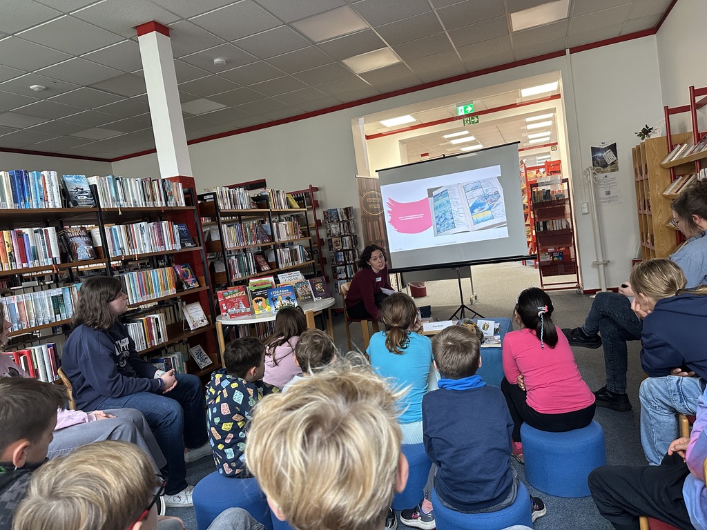Zum Einstieg gab es ein Bilderbuchkino rund um das Thema Comic. Danach wurde in der Stadtbücherei gestöbert, analysiert und entdeckt: Was macht einen Comic eigentlich aus? Schnell war klar – ohne Sprechblasen, Bewegungslinien und „BOOM!“ oder „ZACK!“ geht es nicht. Mit ersten Strichmännchen-Übungen und Geräuschworten entstanden eigene Comic-Helden.